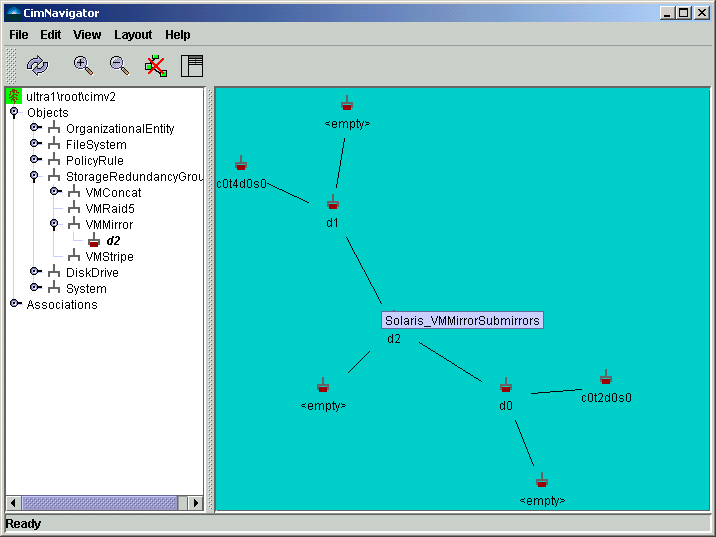 related to d2 via the Solaris_VMMirrorSubmirrors association. From this display, it can also